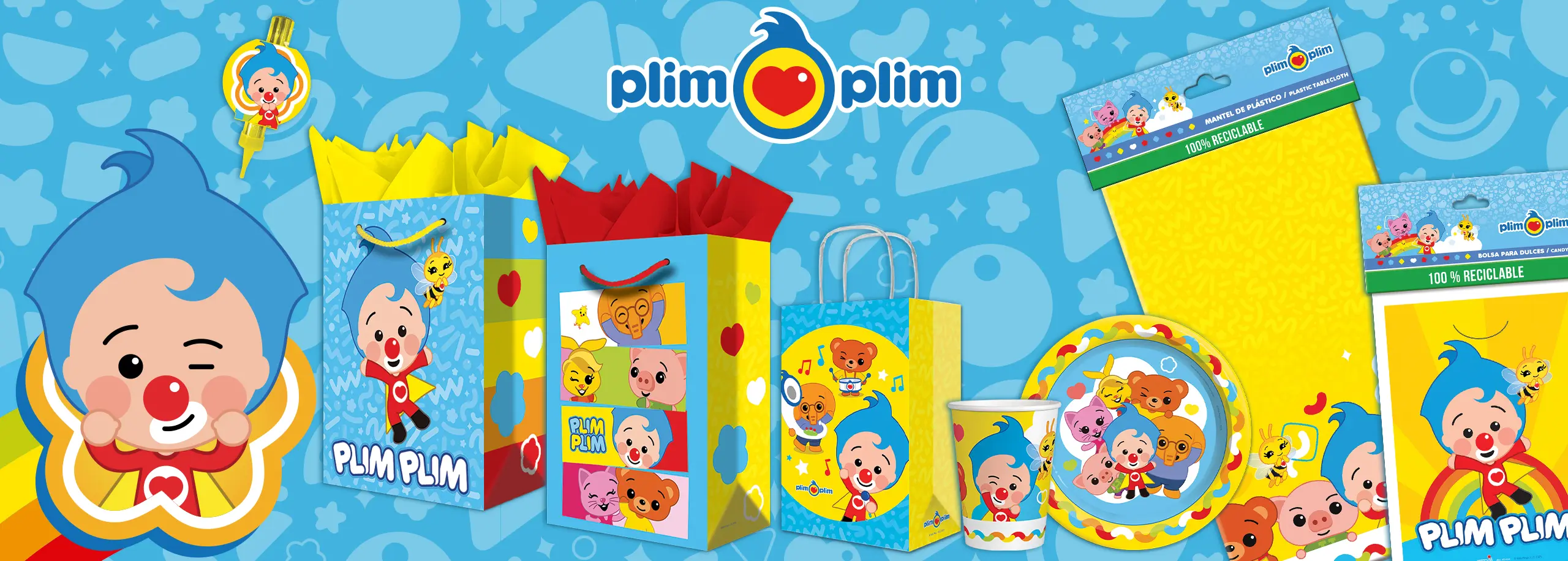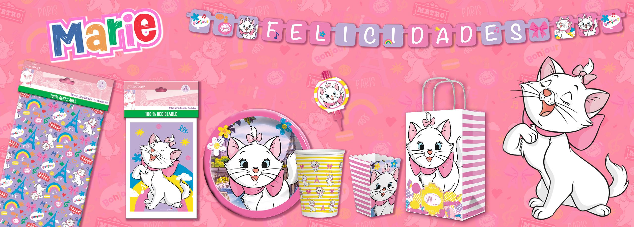 Invitaciones, platos, vasos, bolsita para dulces, servilletas, mantel, cajas para dulces, toppers, distintivos, velas, adornos y decoraciones.